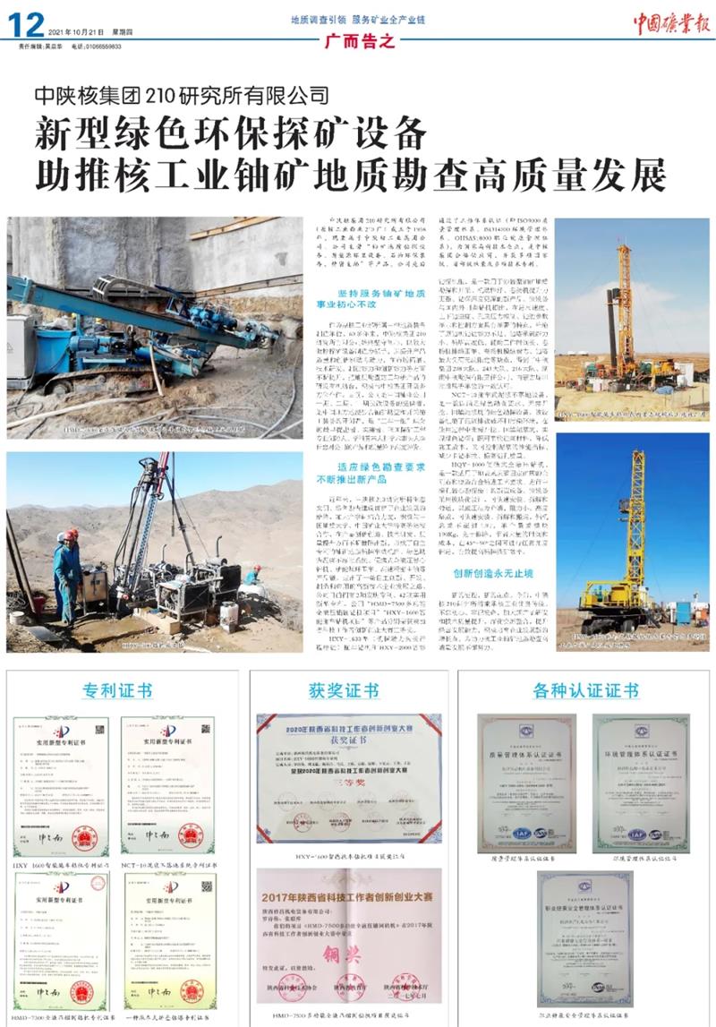 適應(yīng)綠色勘查要求不斷推出新產(chǎn)品。近年來,中陜核210研究所將生態(tài)文明、綠色勘查建設(shè)貫穿于企業(yè)發(fā)展的始終,加大產(chǎn)學(xué)研結(jié)合力度,積極與中國地質(zhì)大學(xué)、中國礦業(yè)大學(xué)等高等院校進(jìn)行合作,在產(chǎn)品創(chuàng)新創(chuàng)造、技術(shù)研發(fā)、質(zhì)量提升方面不斷推陳出新,形成了自主專利的鈾礦地質(zhì)鉆探車載機(jī)組、綠色勘查泥漿不落地系統(tǒng)、便攜式全液壓巖心鉆機(jī)、新能源環(huán)衛(wèi)車、高速精密主軸等產(chǎn)品鏈,走出了一條自主創(chuàng)新、開發(fā)、制造和應(yīng)用的高新技術(shù)企業(yè)發(fā)展之路。公司目前擁有2項(xiàng)發(fā)明專利、42項(xiàng)實(shí)用新型專利,公司“HMD-7500多功能全液壓錨固鉆機(jī)項(xiàng)目”“HXY-1600智能拖車鉆機(jī)項(xiàng)目”等產(chǎn)品分別榮獲陜西省科技工作者創(chuàng)新創(chuàng)業(yè)大賽三等獎。