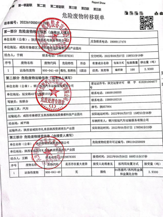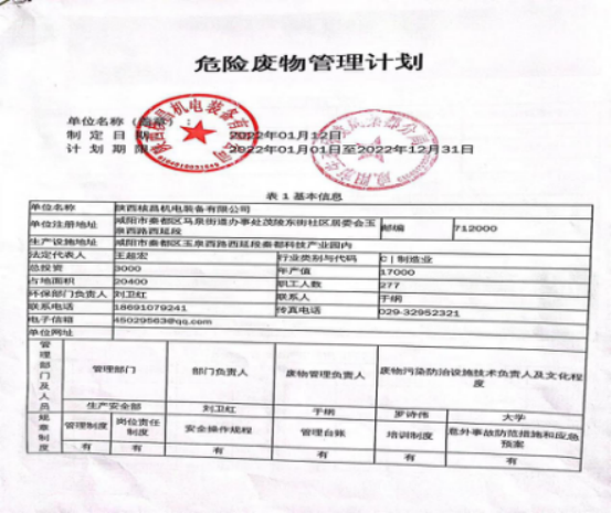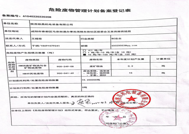 我公司屬機電一體化、機械加工等產業的生產及經營活動, 現階段主要的危險廢物包括:油漆桶、廢機油、乳化液、噴漆、噴砂。油漆桶、廢機油、乳化液等危險廢物處置由陜西明瑞資源再生有限公司承接轉運及處理危廢;噴漆、噴砂房等由公司投入大量資金進行升級改造,在經營活動中加強職工環保培訓,不斷提升職工環保意識。陜西格林秦灃環保科技有限公司監測,所排廢氣均達到國家標準為改善環境、大氣質量作出積極的貢獻。